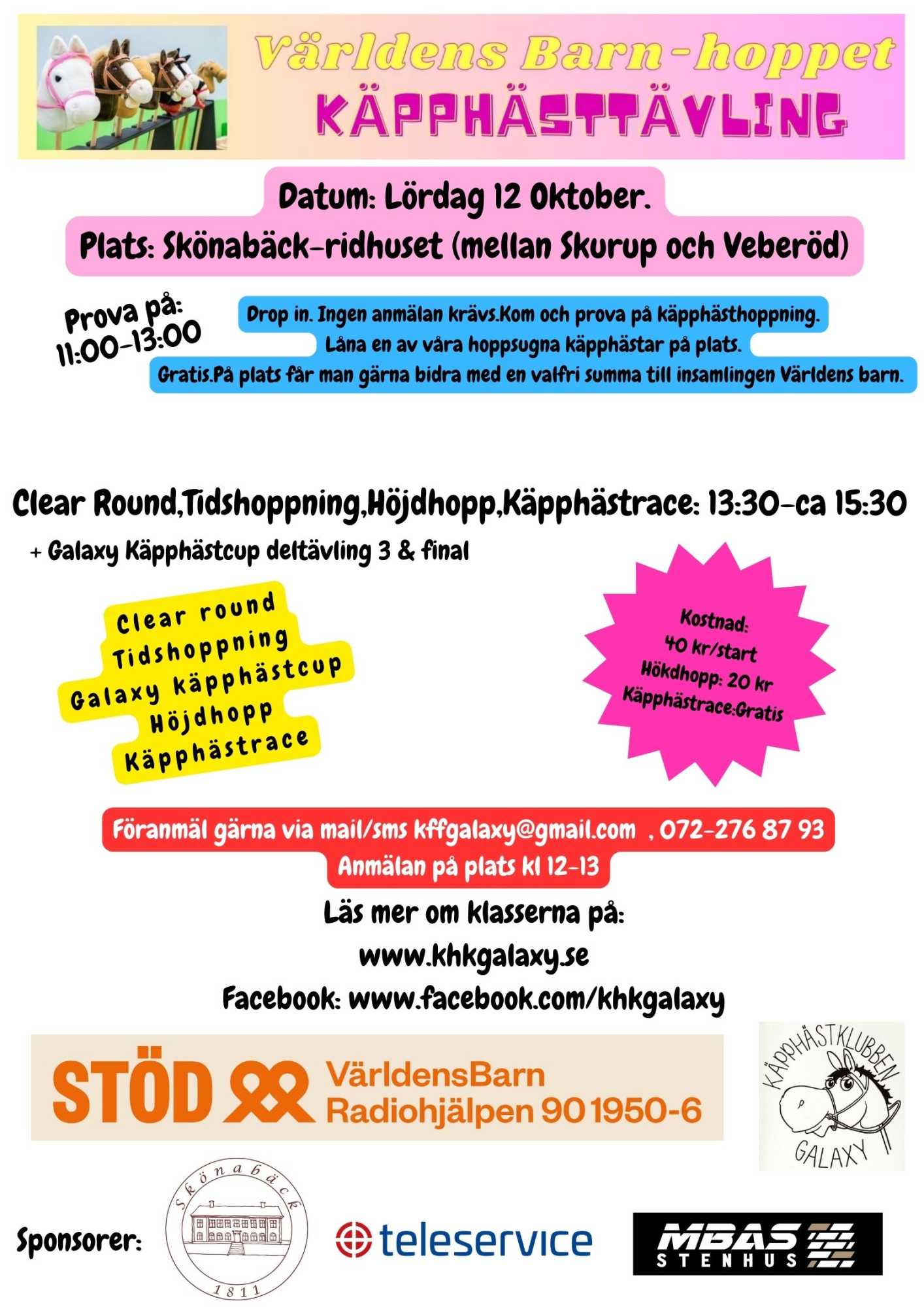 Lördagen den 12 oktober ordnar vi en käpphästtävling i ridhuset på Skönabäck som ligger mellan Skurup och Veberöd.Dagen börjar med prova på/drop in mellan kl 11 och 13 och själva käpphästtävlingen börjar 13:30. Anmälan på plats mellan kl 12 och 13.